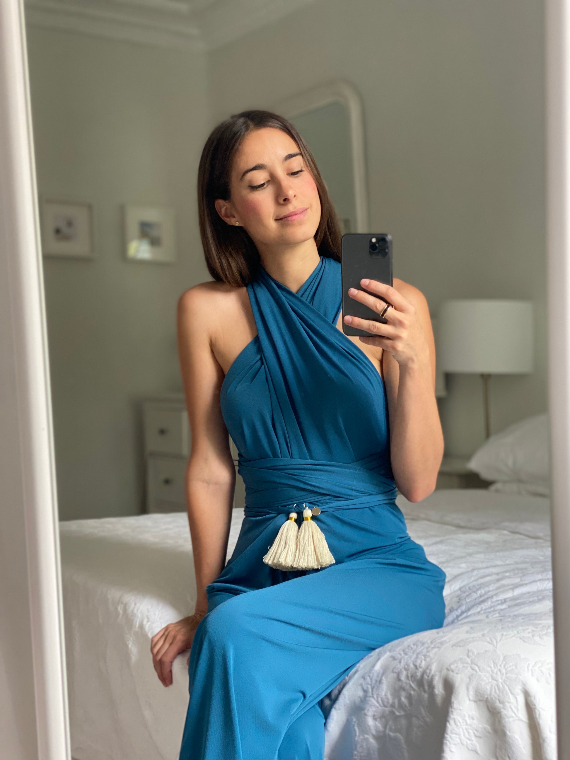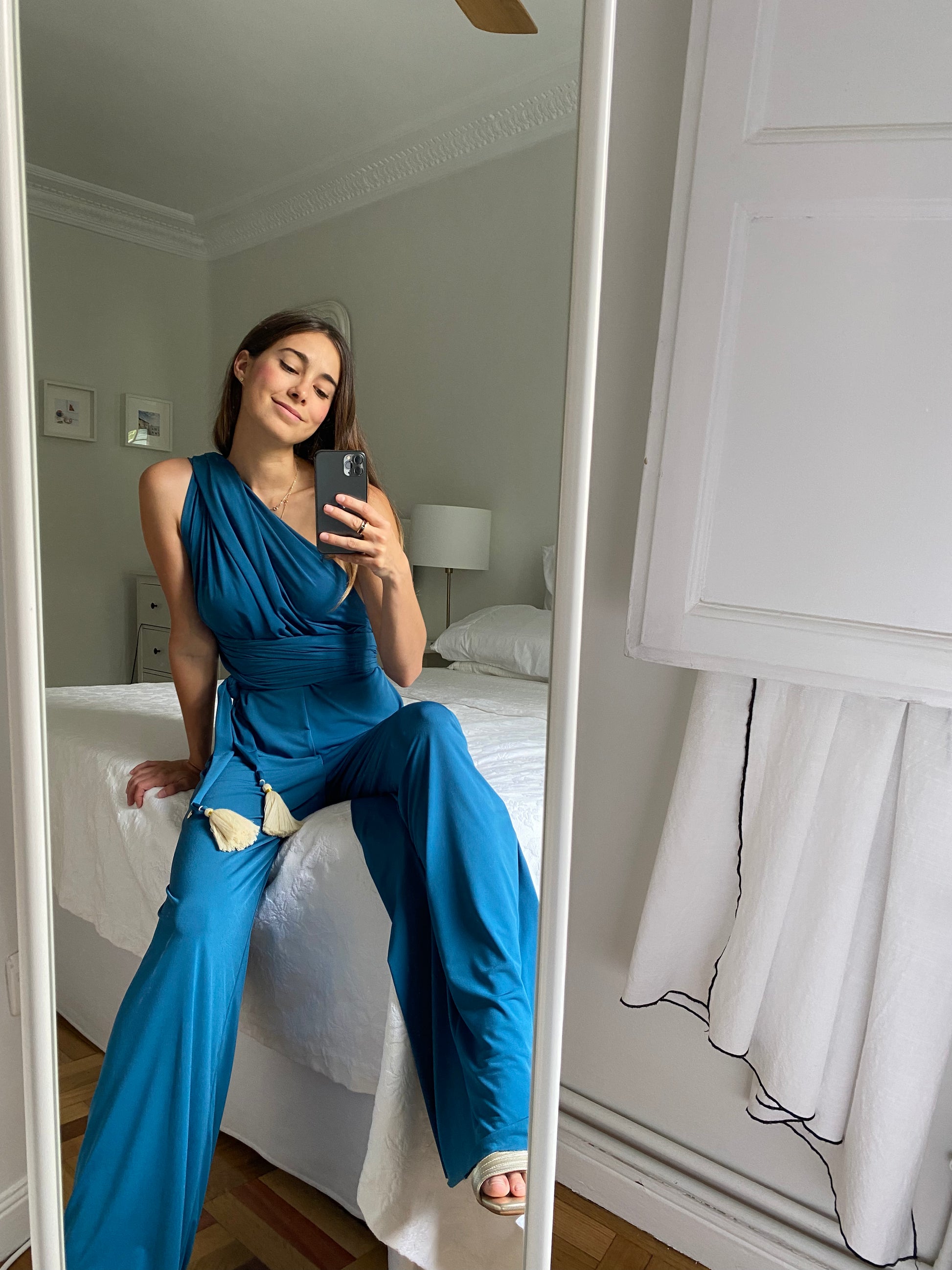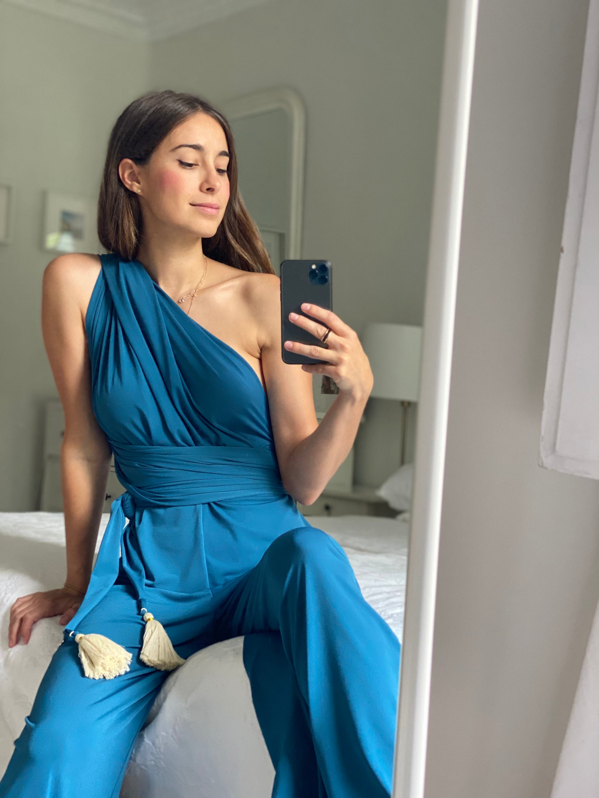 ✰ The Infinite Jumpsuit can be placed in a thousand ways thanks to its two long straps. You can wear it with a Top underneath or a Torerita to achieve even more models. Comes with two interchangeable cream pom poms with gold trim ✰